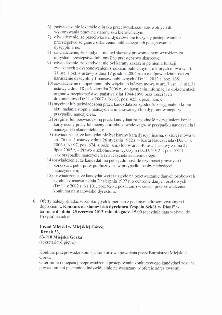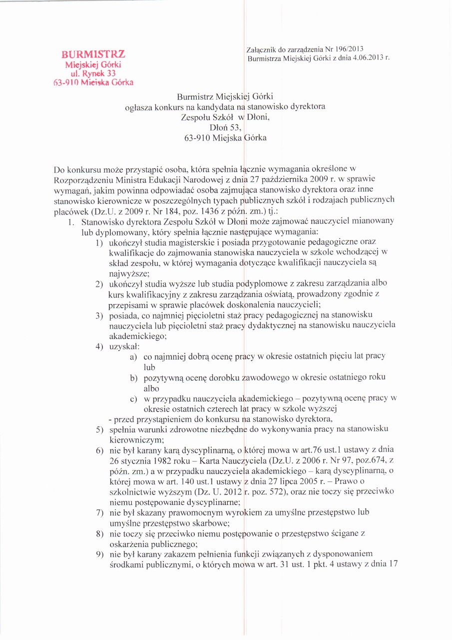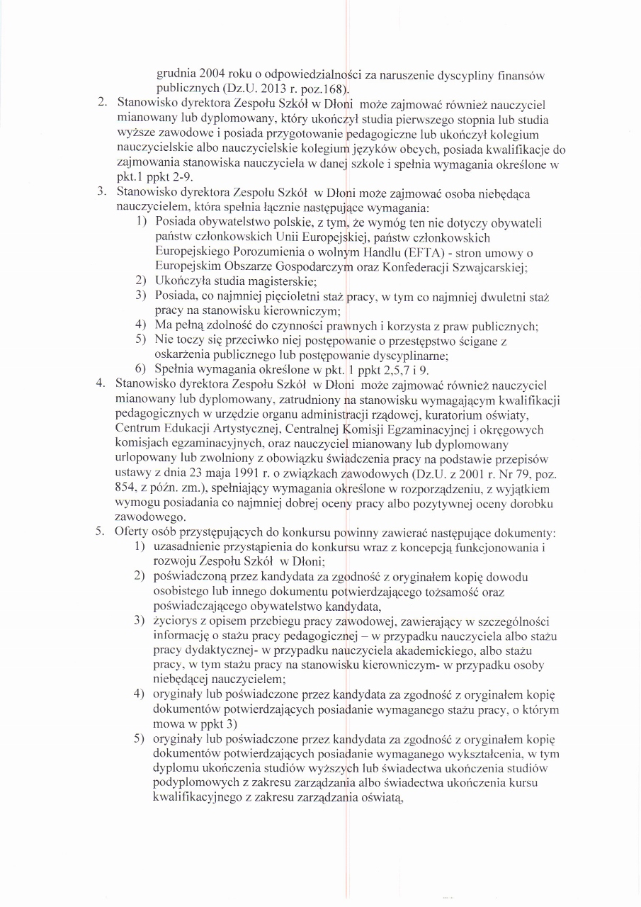 Ogłoszenie konkursu na stanowisko dyrektora Zespołu Szkół w Dłoni