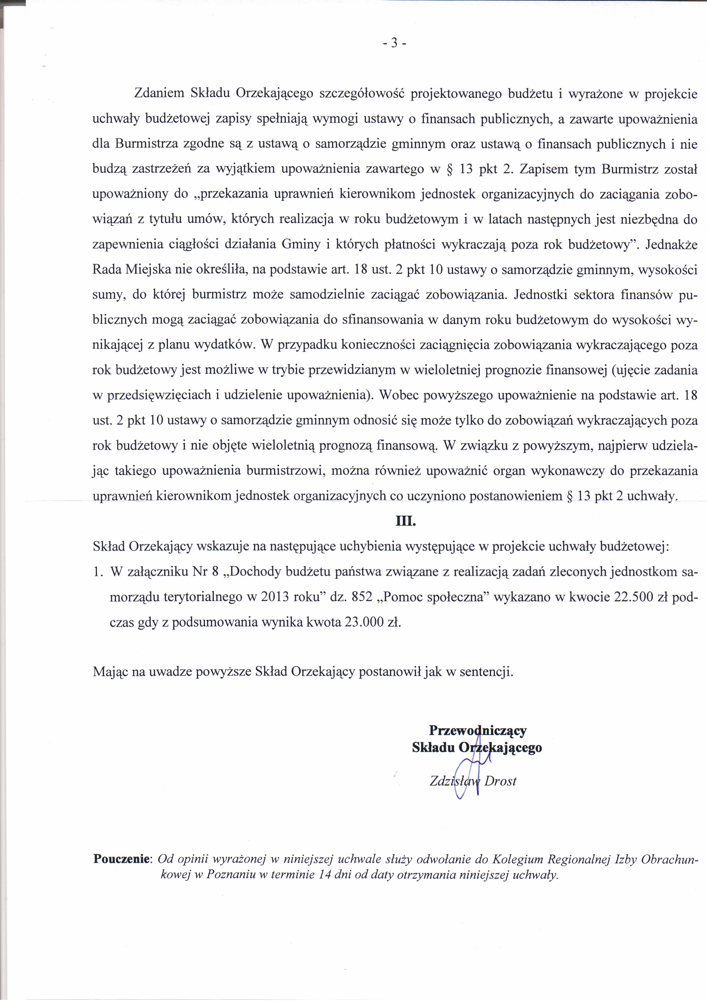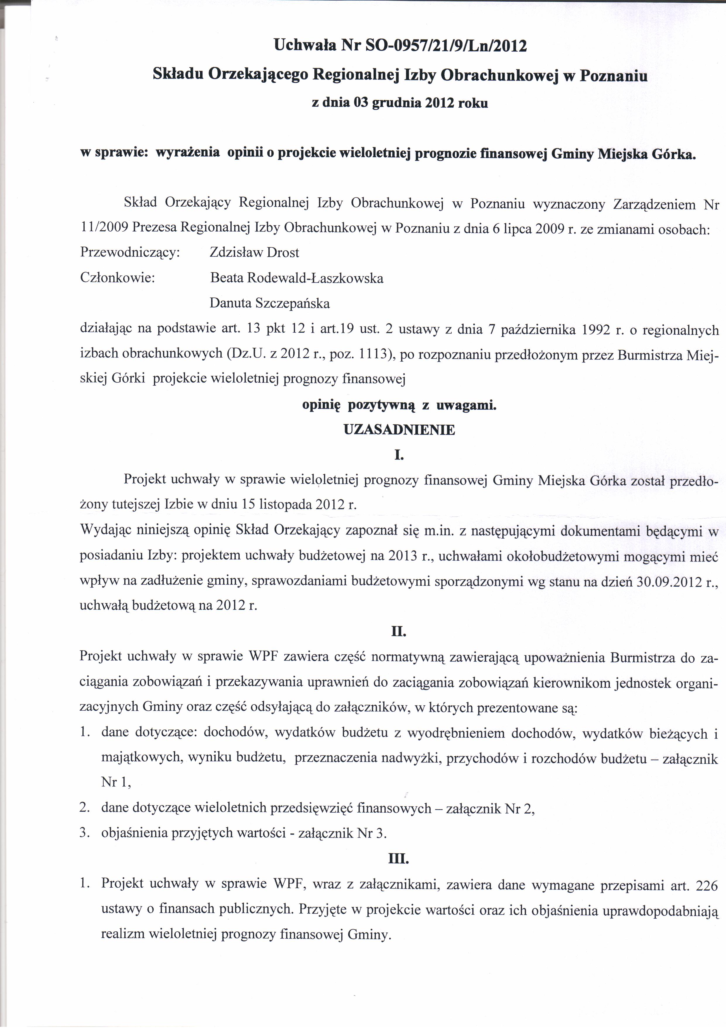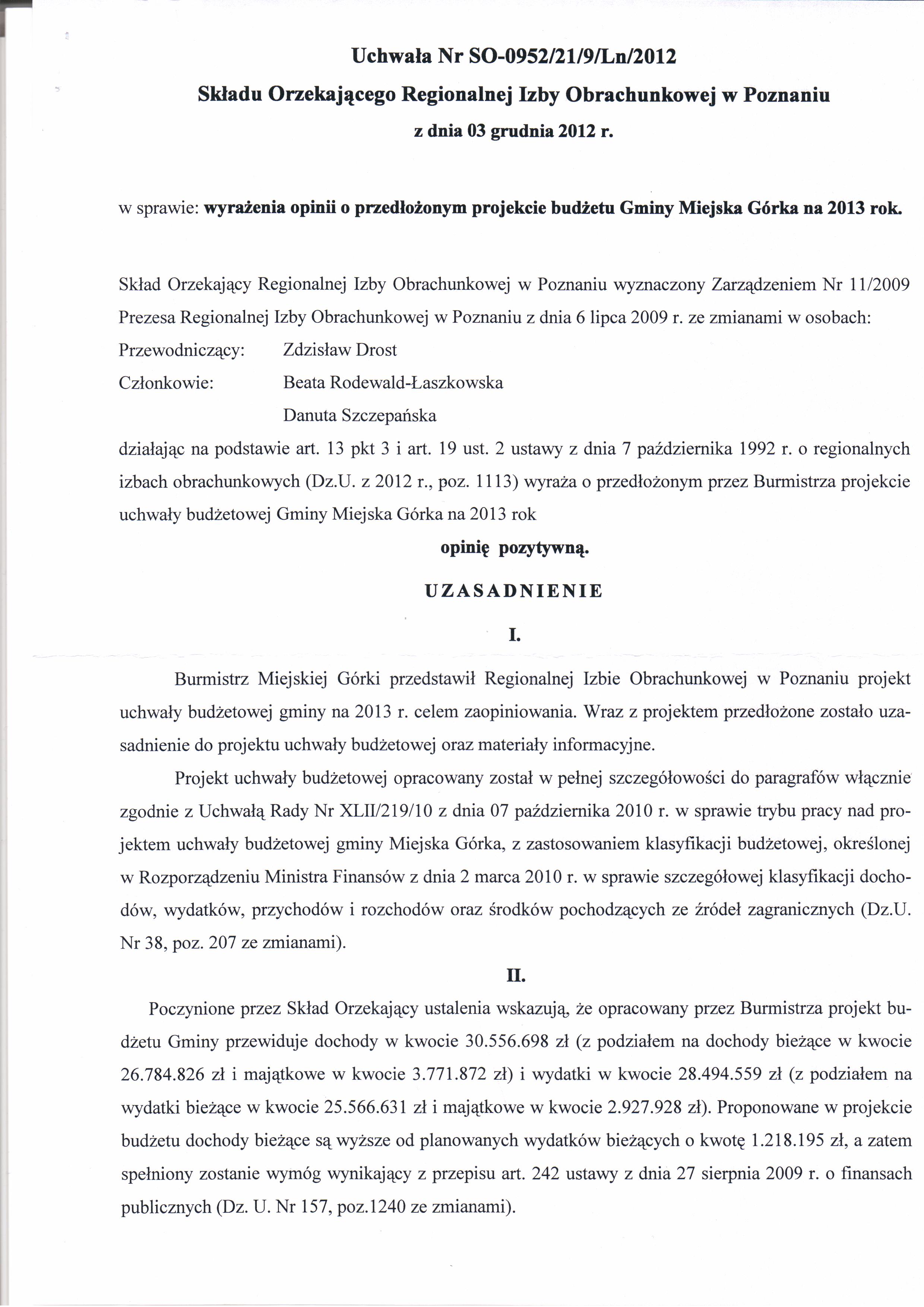 Uchwała Regionalnej Izby Obraczunkowej w sprawie wyrażenia opinii o przedłożonym projekcie budżetu Gminy Miejska Górka na 2013 rok