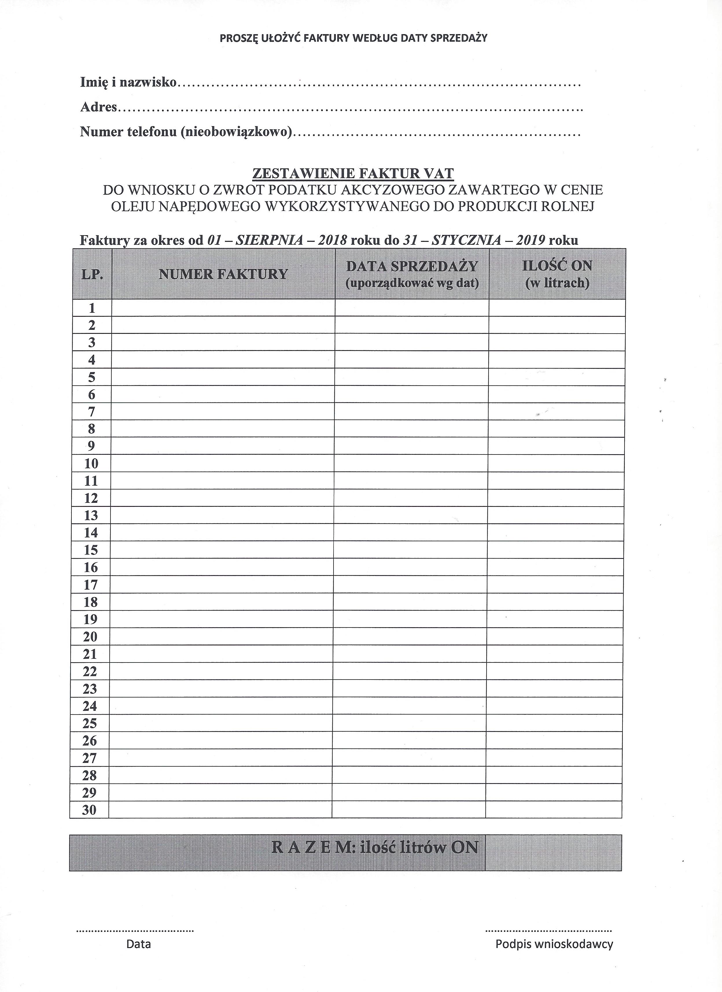 . Wniosek o zwrot podatku akcyzowego zawartego w cenie oleju napędowego wykorzystywanego do produkcji rolnej wraz z fakturami VAT stanowiącymi dowód zakupu oleju napędowego,