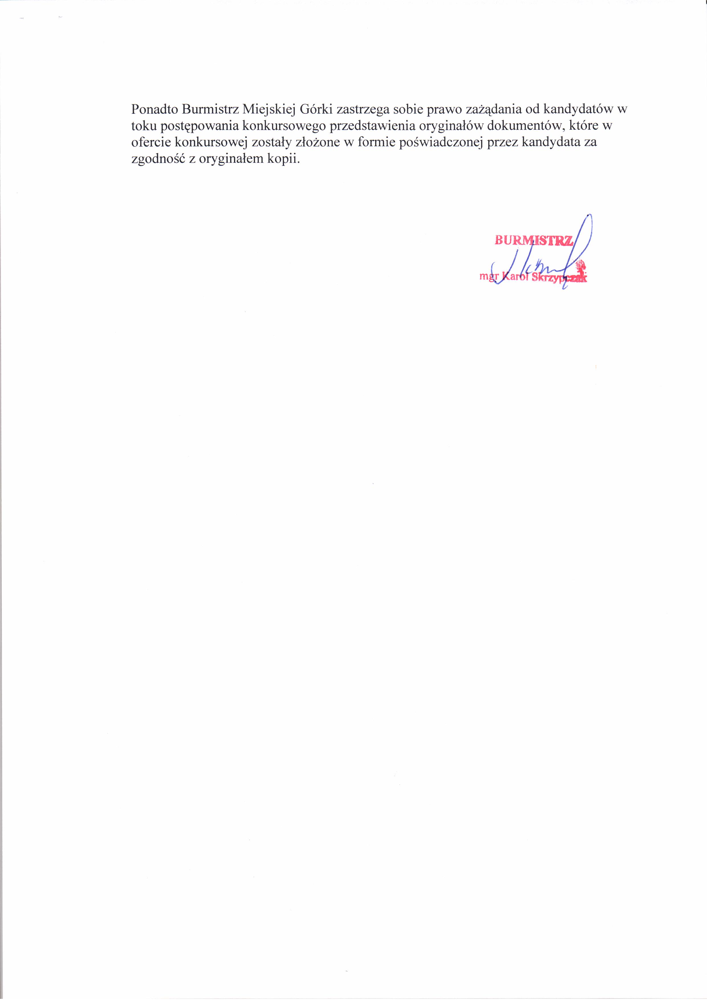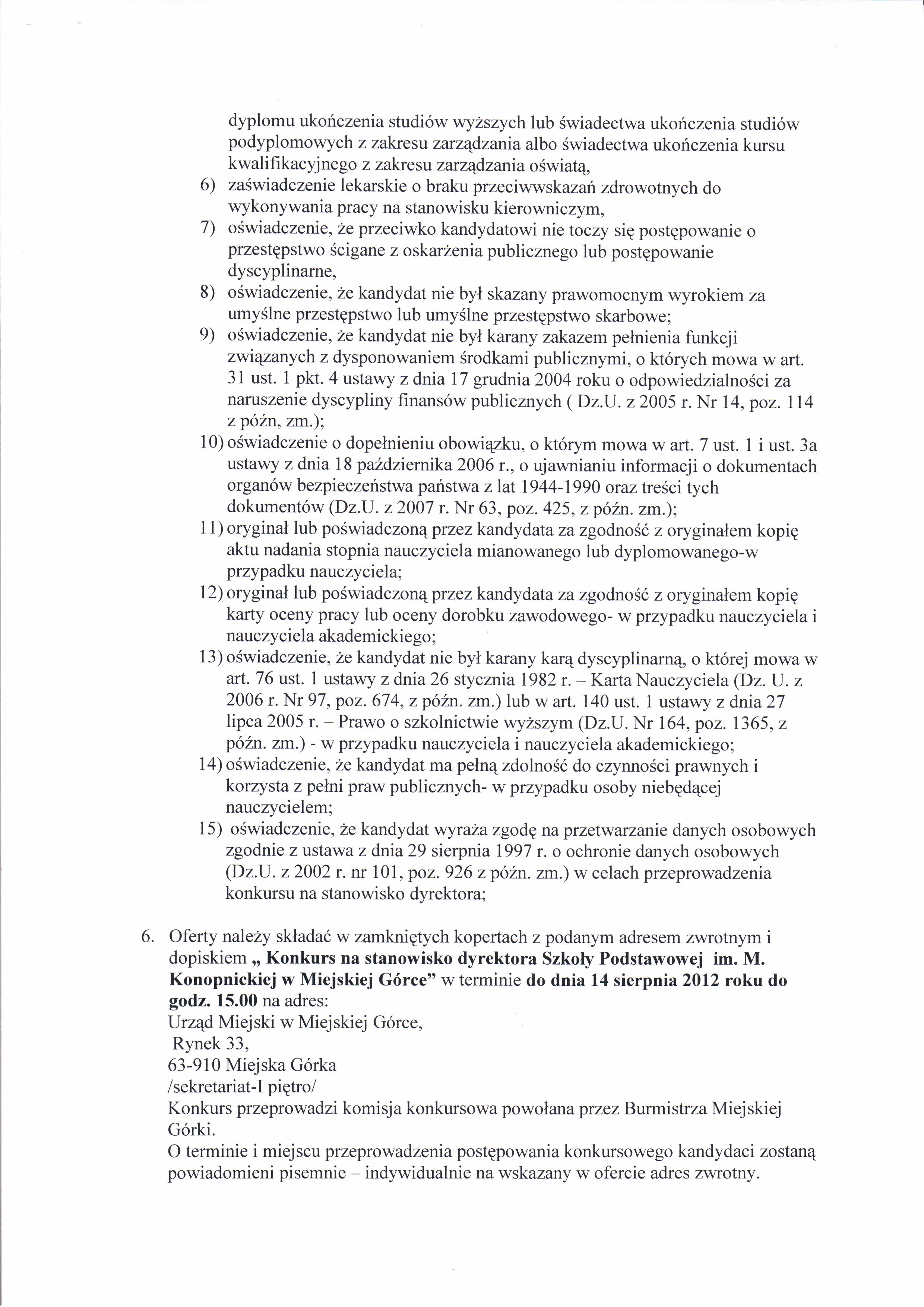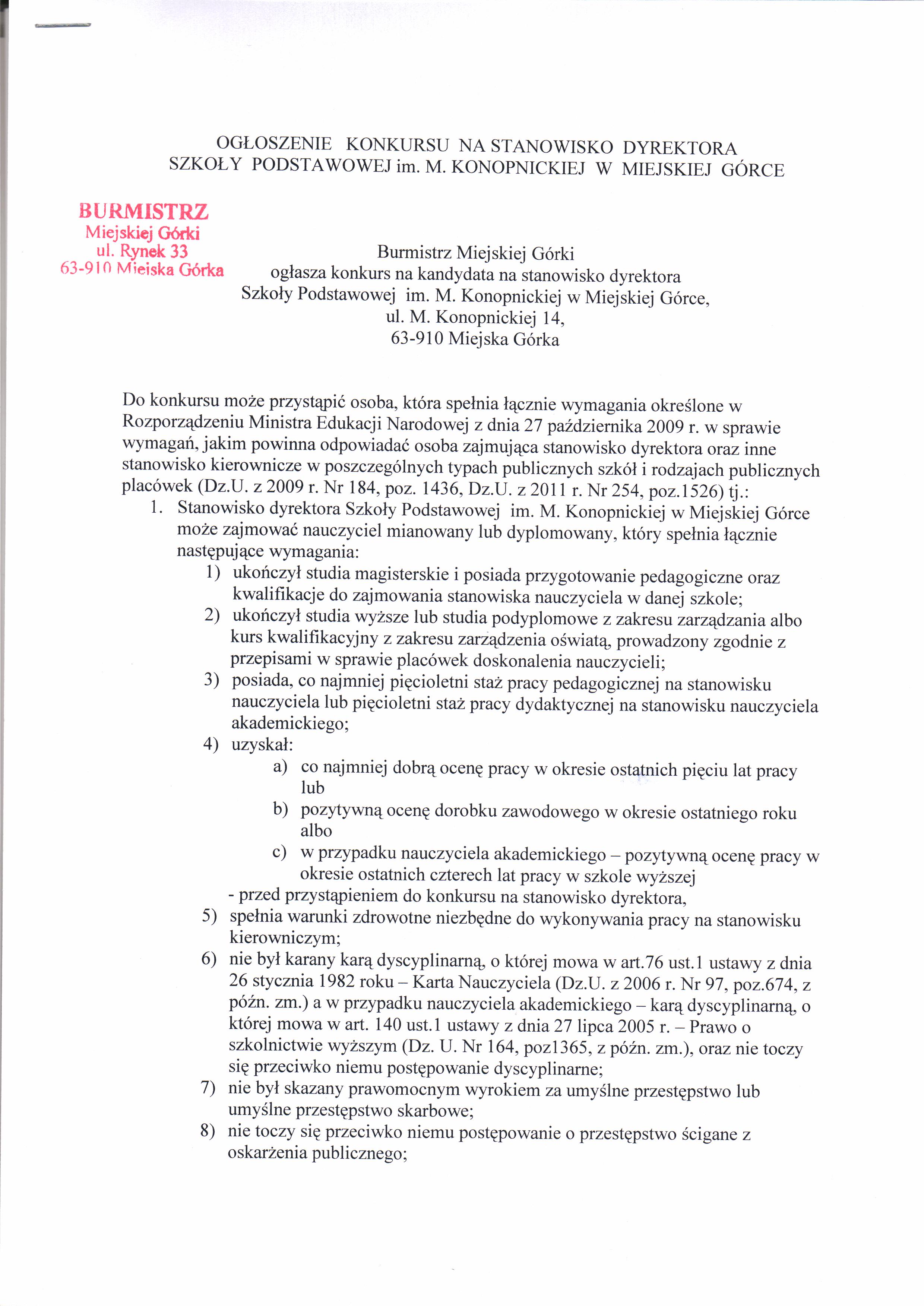 Ogłoszenie konkursu na stanowisko dyrektora Szkoły Podstawowej im. M. Konopnickiej w Miejskiej Górce