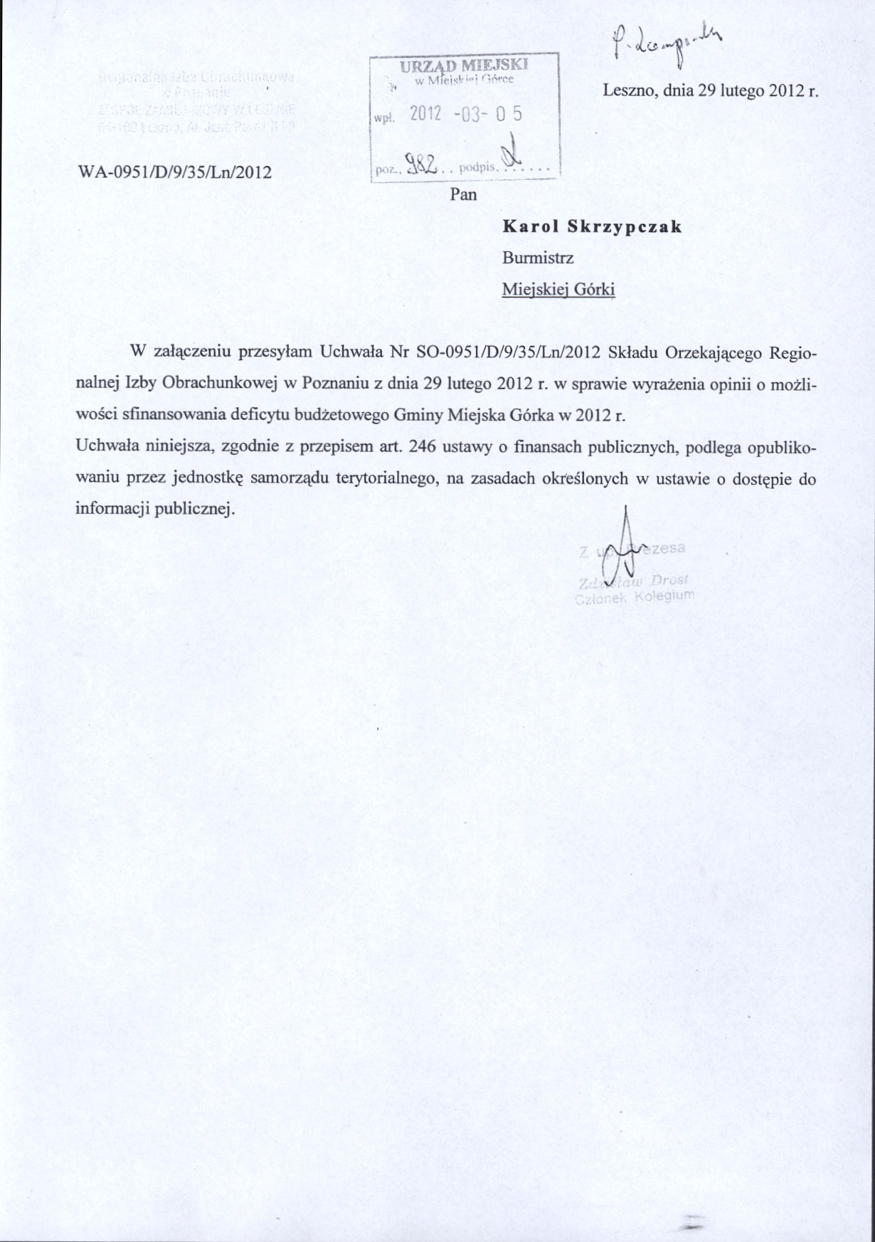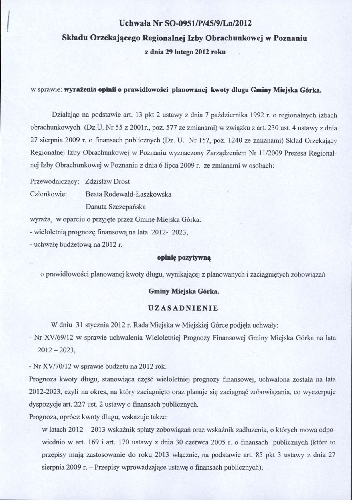 Uchwała Regionalnej Izby Obrachunkowej w sprawie wyrażenia opinii o możliwości sfinansowania deficytu budżetowego Gminy Miejska Górka w 2012r.