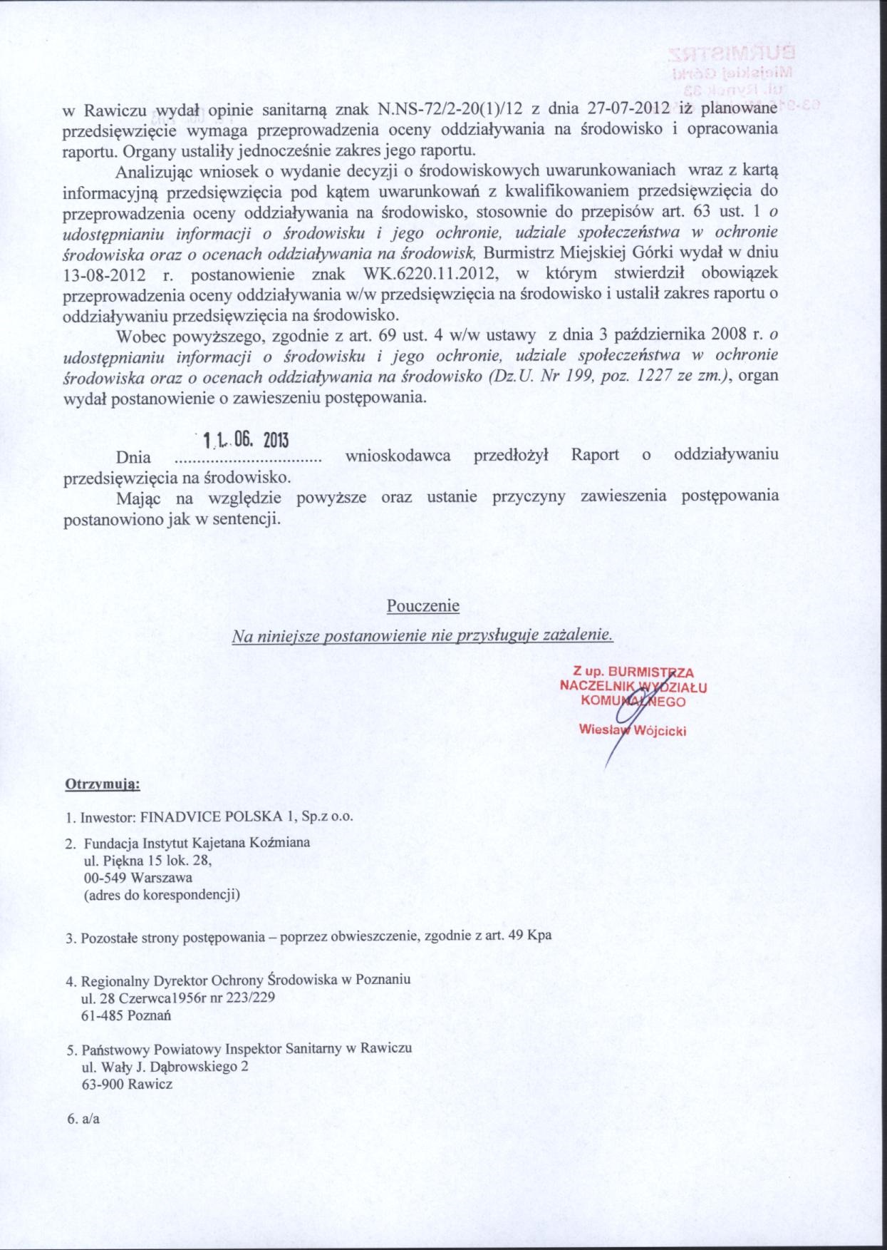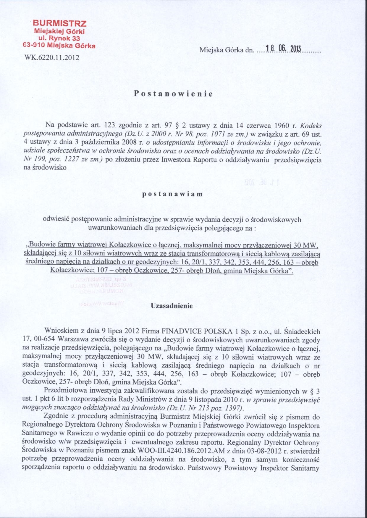 że w dniu 18-06-2013 zostało wydane postanowienie o podjęciu z urzędu zawieszonego postepowania w sprawie wniosku o wydanie decyzji o środowiskowych uwarunkowaniach dot. planowanego przedsięwzięcia pn. „Budowa farmy wiatrowej Kołaczkowice o łącznej, maksymalnej mocy przyłączeniowej 30 MW, składającej się z 10 siłowni wiatrowych wraz ze stacja transformatorową i siecią kablową zasilającą średniego napięcia na działkach o nr geodezyjnych: 16, 20/1, 337, 342, 353, 444, 256, 163 – obręb Kołaczkowice; 107 – obręb Oczkowice, 257- obręb Dłoń, gmina Miejska Górka”.