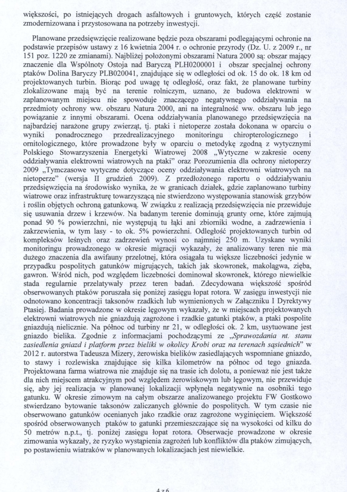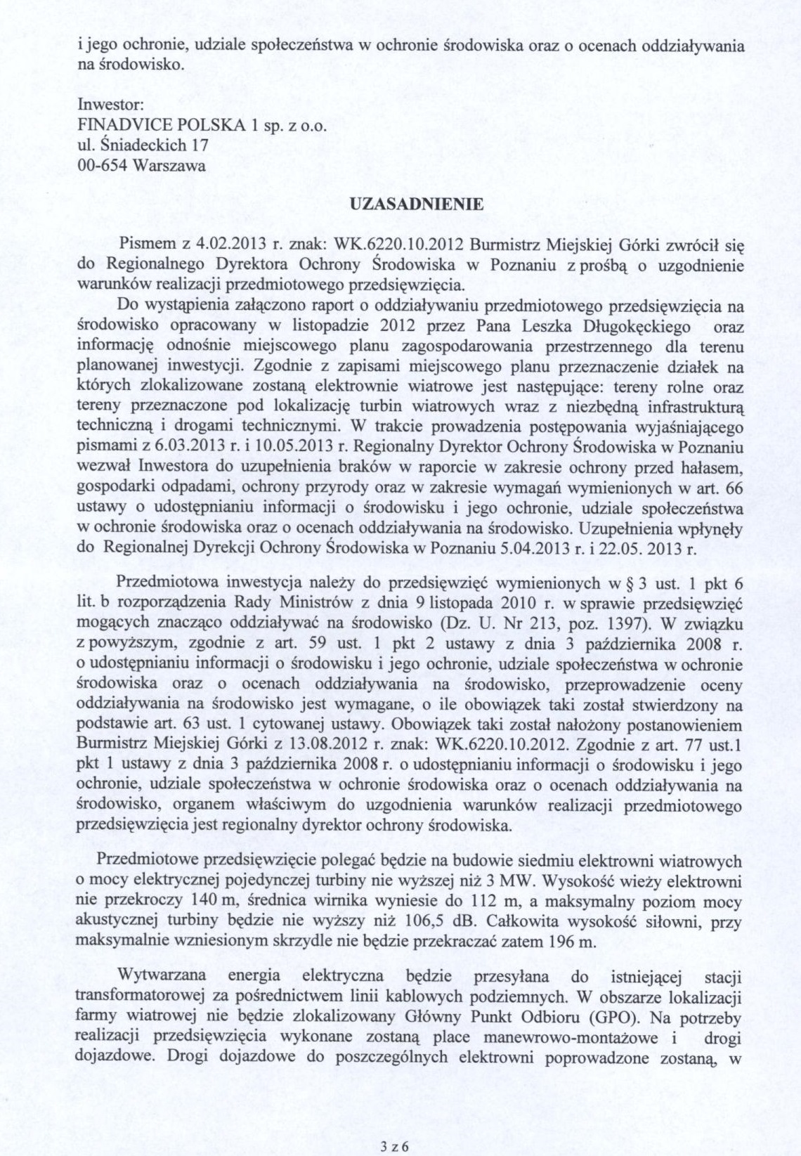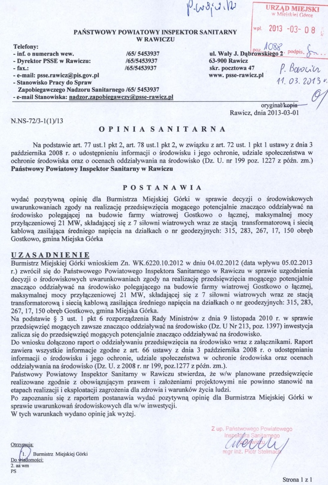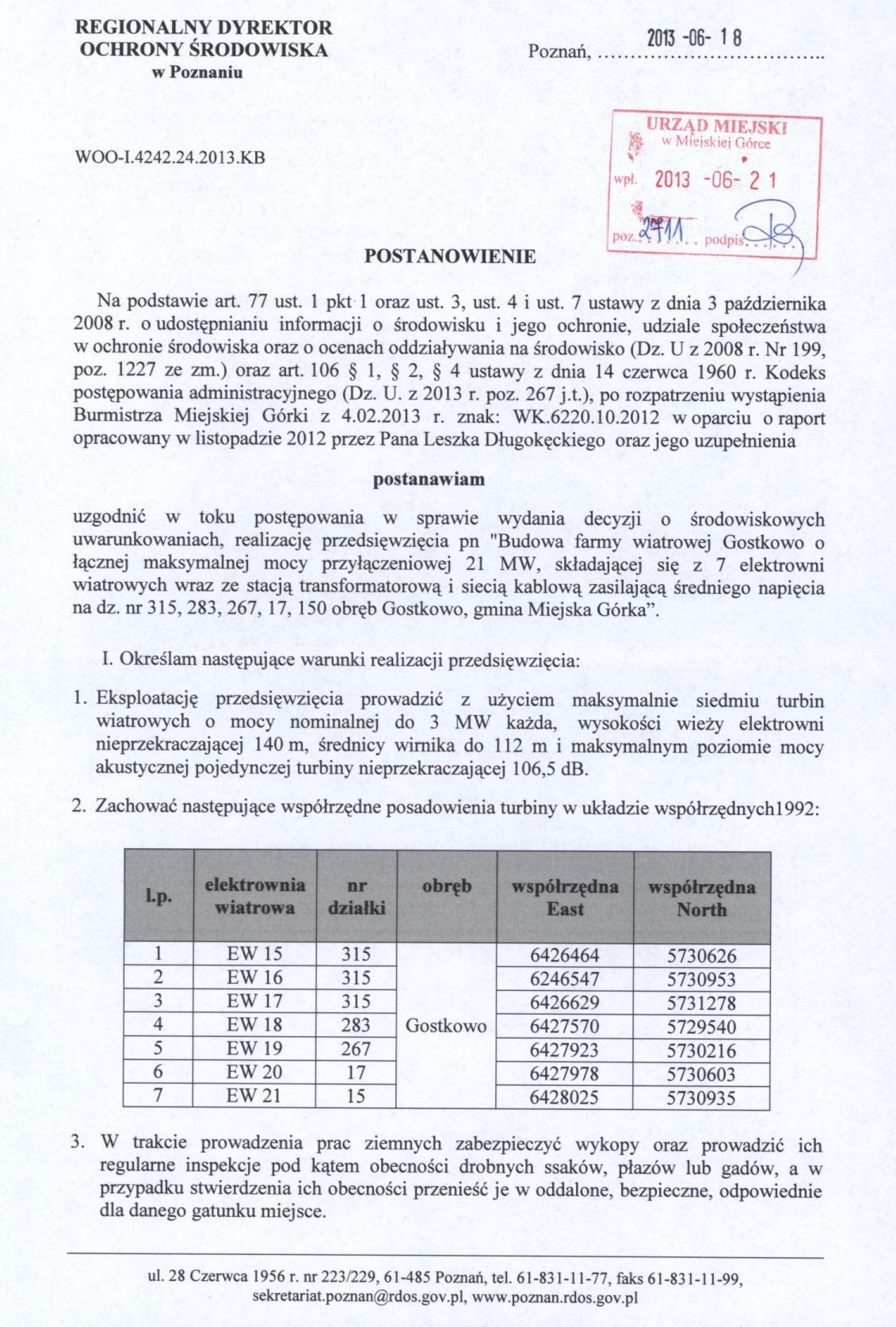 Regionalny Dyrektor Ochrony Środowisk w Poznaniu, postanowieniem. Nr WOO-I/4242.24.2013.KB uzgodnił realizacje przedsięwzięcia pn. „Budowa farmy wiatrowej Gostkowo o łącznej, maksymalnej mocy przyłączeniowej 21 MW, składającej się z 7 siłowni wiatrowych wraz ze stacja transformatorową i siecią kablową zasilającą średniego napięcia na działkach o nr geodezyjnych: 315, 283, 267, 17, 15 obręb Gostkowo, gmina Miejska Górka”Państwowy Powiatowy Inspektor Sanitarny pismem Nr N.NS-72/3-1(1)/13 wydał pozytywną opinie dla ww. przedsięwzięcia.